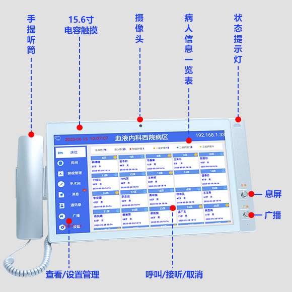 搭配 15.6 寸电容触摸大屏,操作流畅直观;配备手提听筒与高清摄像头,支持呼叫接听、双向对讲,屏幕实时展示病人信息一览表,配合状态提示灯,让病区情况一目了然。