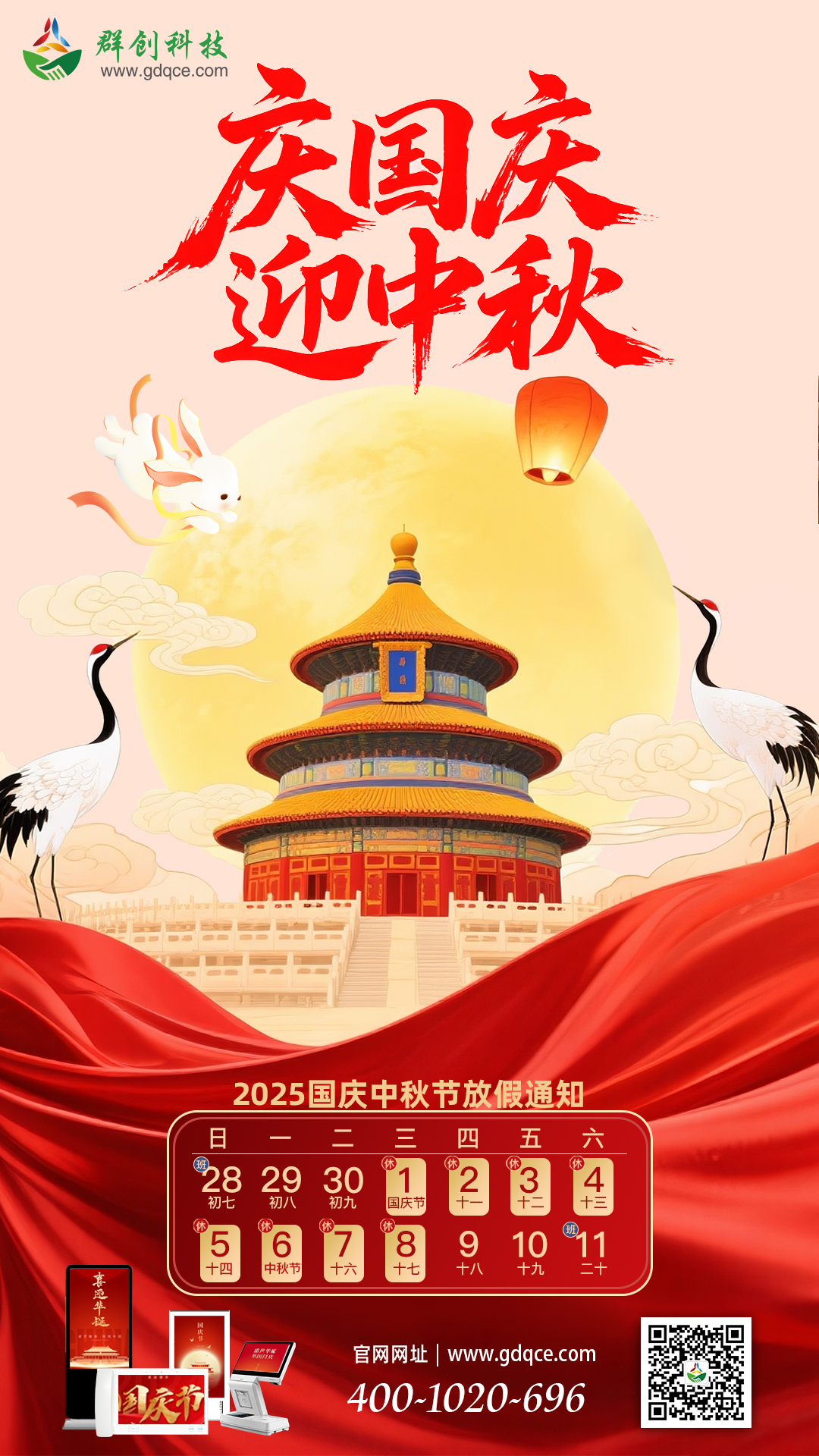 根据国务院通知,群创科技中秋国庆双节放假安排如下:10月1日(星期三)至10月8日(星期三)放假调休,共8天。