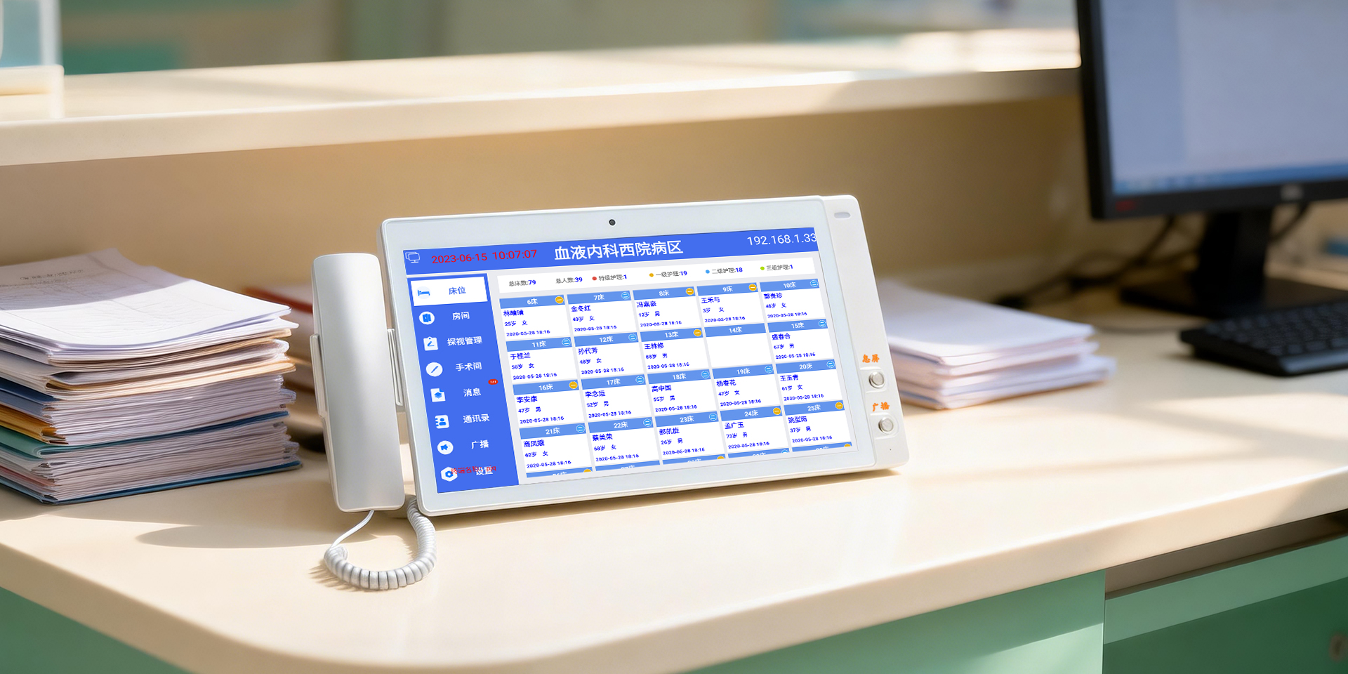 搭配 15.6 寸电容触摸大屏,操作流畅直观;配备手提听筒与高清摄像头,支持呼叫接听、双向对讲,屏幕实时展示病人信息一览表,配合状态提示灯,让病区情况一目了然。