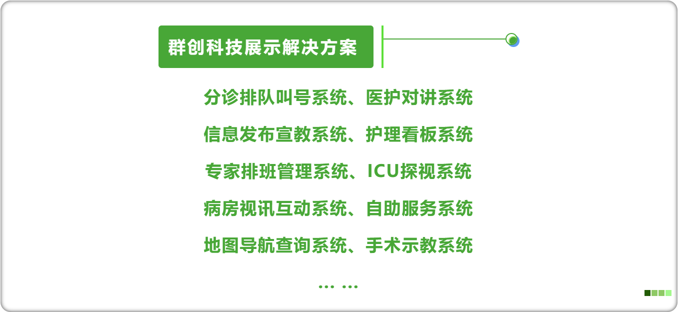 广东群创信息科技有限公司是一家集医疗导诊系统及智慧医疗信息可视化产品研发、生产、销售为一条龙的高科技创新型公司,拥有卓越的智慧医疗解决方案和强大的技术服务支持。
