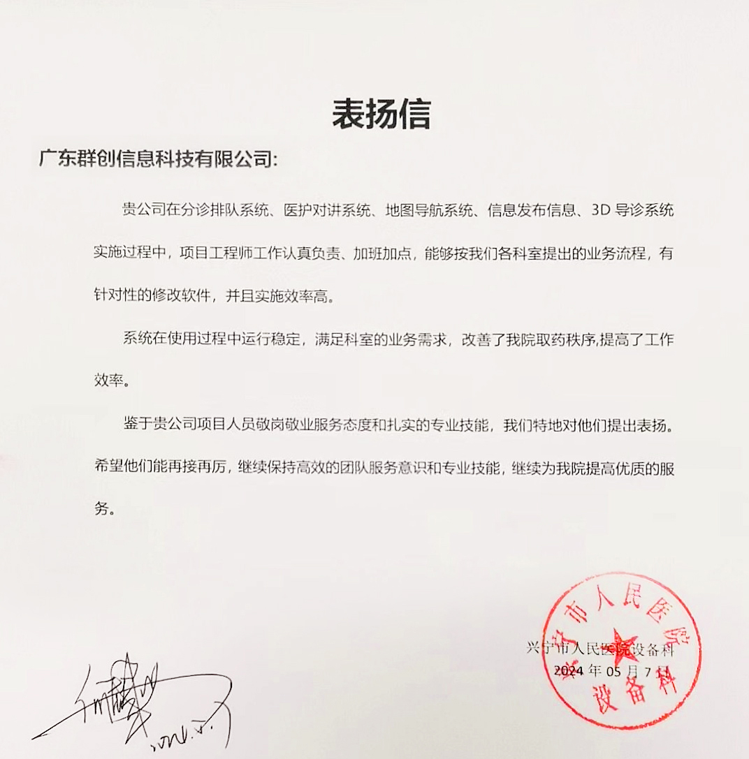 信中对在我院部署的智慧医院整体解决方案的应用成效给予了高度评价,并特别对我司技术工程师团队所展现出的专业素养及卓越的服务品质提出了表扬。